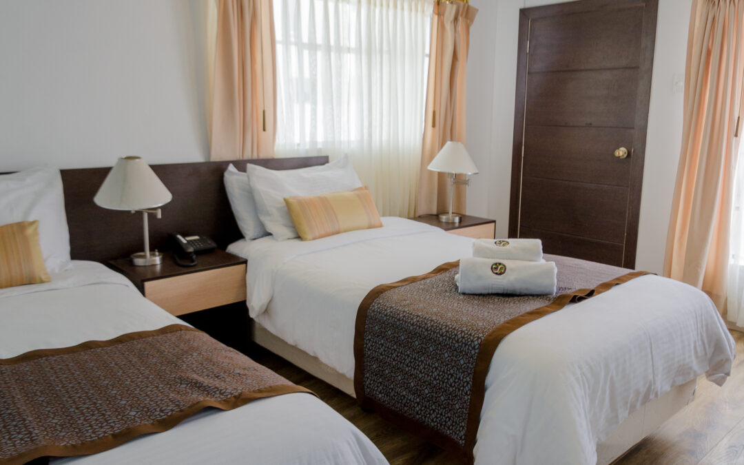 Habitación cuádruple con entrada privada, sofá y minibar.